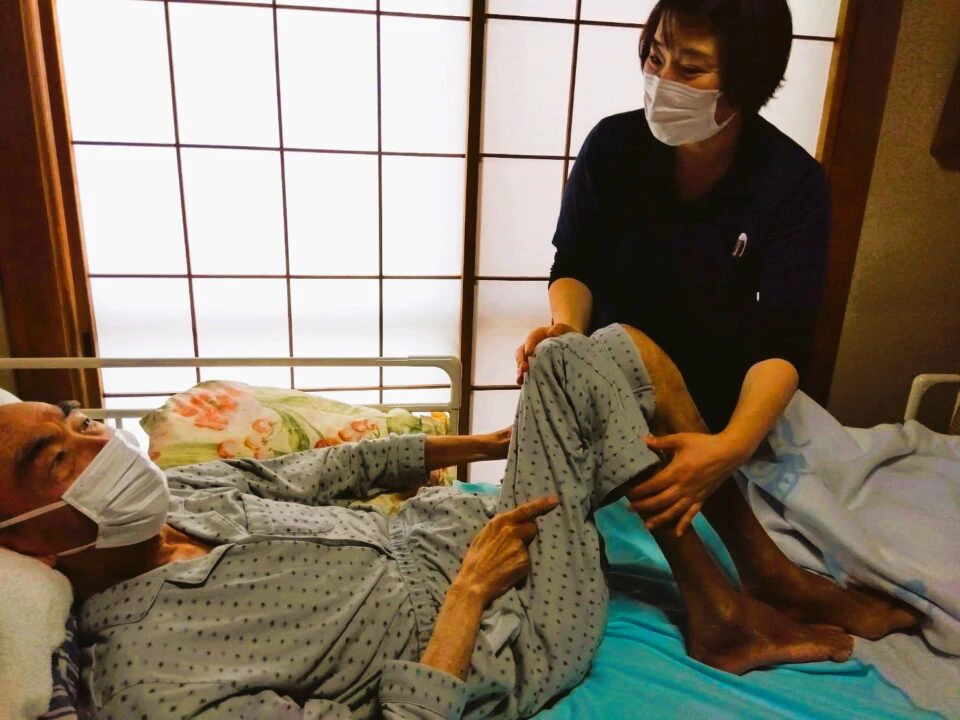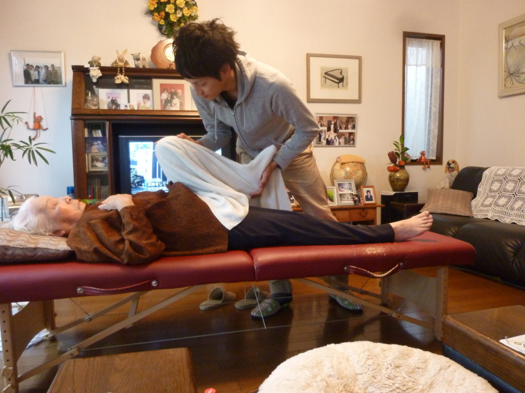訪問で行える施術は鍼灸治療であり、鍼を刺すだけでなく、小型低周波治療器で電気刺激を送ったり、鍼の柄に灸を巻きつけて燃やす灸頭鍼というやり方もあります。電気刺激を送る方法は、痛みの抑制や筋肉の緊張を緩める効果が期待できます。